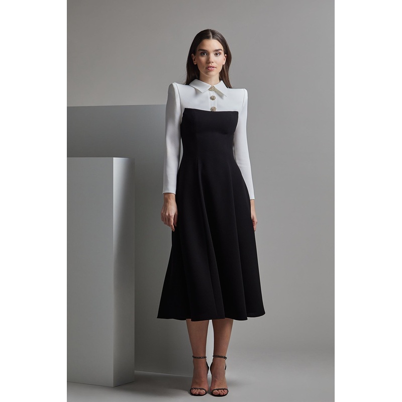 White shirt. Featuring a collared neckline, big buttons, and structured shoulders, with long sleeves. Complemented with a black corset A-line midi dress.