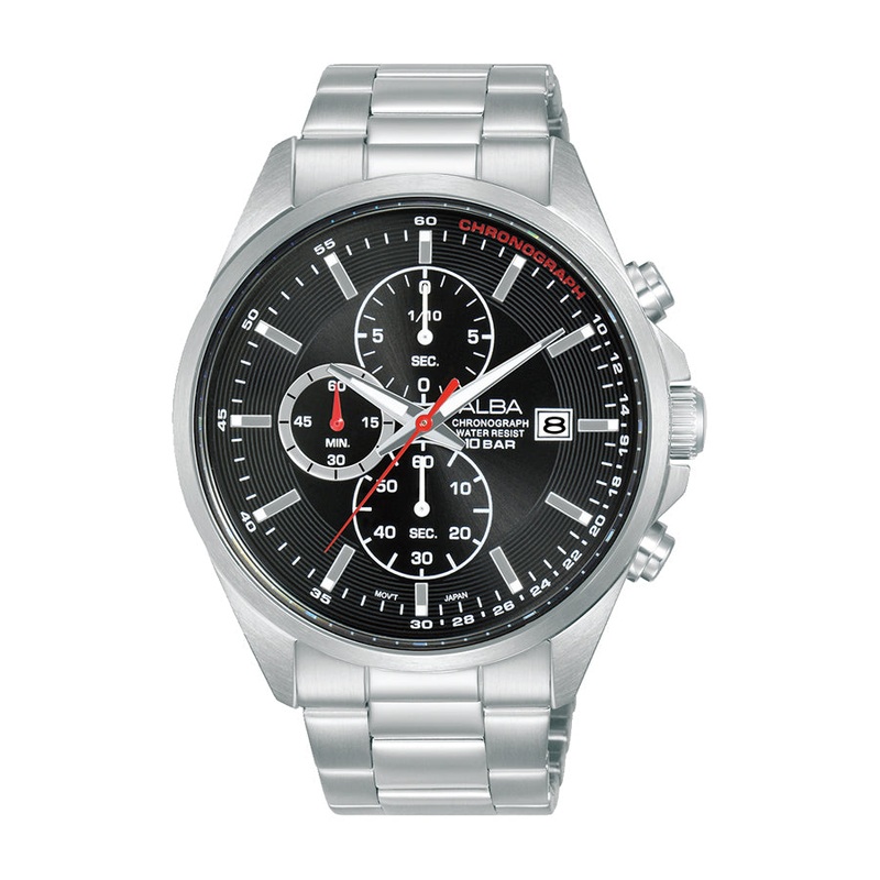 Watch technical specs Strap MaterialStainless steelCase ShapeRoundMovementQuartzGenderMenCase Size43mmMovement Function3 hands with date, 60 minute chronograph 1/10th second subdialWater Resistance10 BARWarranty1 Year International