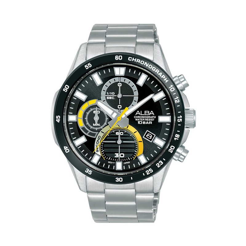Watch technical specs Strap MaterialStainless steelCase ShapeRoundMovementQuartzGenderMenCase Size43mmMovement Function3 hands with date, 60 minute chronograph 1/10th second subdialWater Resistance10 BARWarranty1 Year International