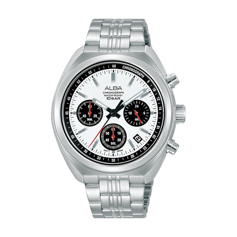 Watch technical specs GenderGentsCase ShapeRoundCase Size40.95mmCase MaterialStainless SteelBandBraceletStrap MaterialStainless steelMovementAlba VD53Movement Function3 hands with date, 60 minute chronograph and 24 hour subdialWater Resistance10 ATMWarrant