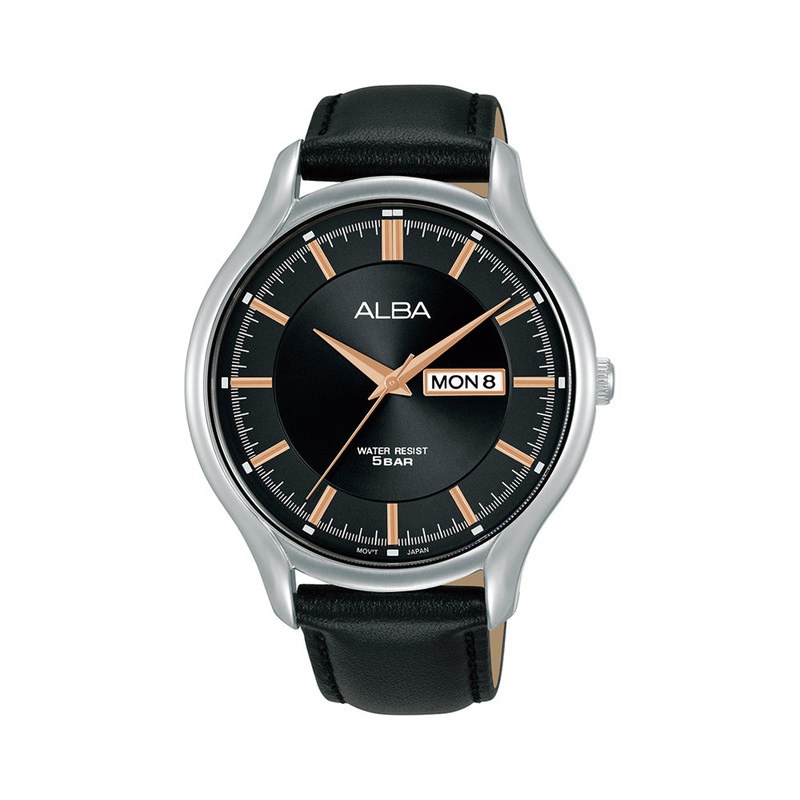 Watch technical specs GenderGentsCase ShapeRoundCase Size43mmCase MaterialStainless SteelBandStrapStrap MaterialGenuine LeatherMovementAlba VJ43Movement Function3 hands with day and dateWater Resistance5 ATMWarranty1 Year International