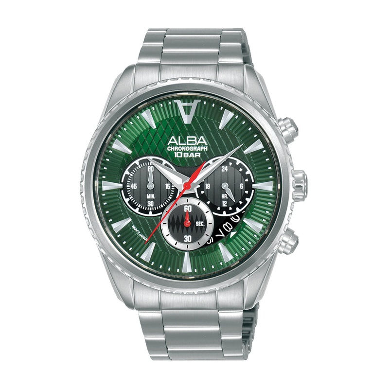 Watch technical specs Strap MaterialStainless steelCase ShapeRoundMovementQuartzGenderMenCase Size43mmMovement Function3 hands with date, 60 minute chronograph and 24 hour subdialWater Resistance10 BARWarranty1 Year International