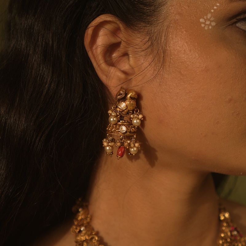 Amulya EarringsPeacocks pirouette through coral skies, their jhumkas humming ancient temple melodies. Material & Composition: 92.5 Sterling Silver with 22ct Gold Plating Stones: White Kundan Stone, Red Beads, White Pearls Handmade in Chennai: Every item is