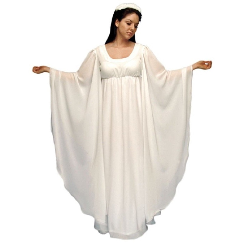 Tranquil beauty at its best.Includes: Angelic empire waist gown accented with wire hemmed flowing sleeves & skirt.Both bodice & skirt are lined.Color: White (Chiffon or Velvet)Size (Bust): S (34), M (36),L (39), XL (42)Made in USA /White Chiffon or Velvet