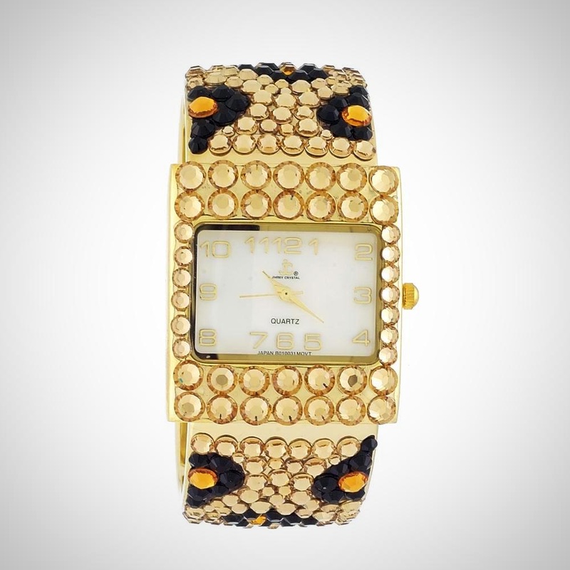 Elegant silver and gold-tone watch featuring sparkling crystals accents on the bangle Embellished with crystals, which are set by Jimmy Crystal's expert craftsmanship. This product provides unparalleled aesthetics to transcend elegance. JCNY logo at 12 o'c