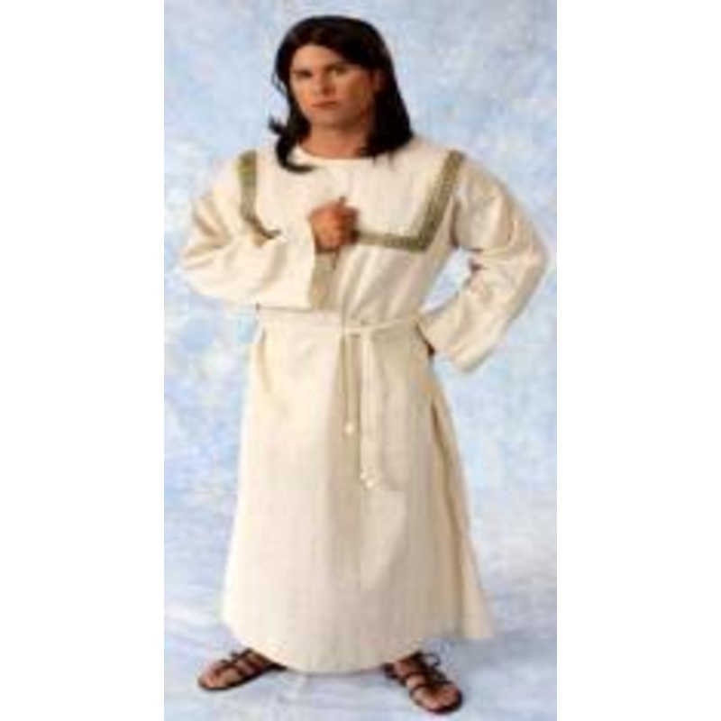 Includes: Earthtone textured gown w/gold trim & rope belt.Colors: Assorted Natural TonesSize: One Size (up to 50" Chest)