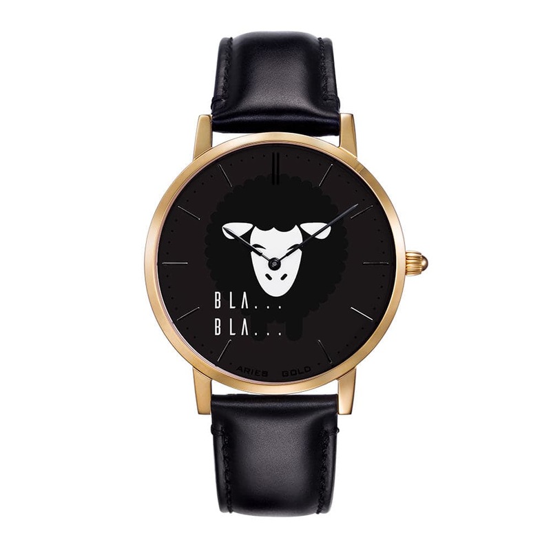 ARIES GOLD CUSTOMISED GOLD STAINLESS STEEL WATCH – BLA BLA BLACK UNISEX LEATHER STRAP WATCH