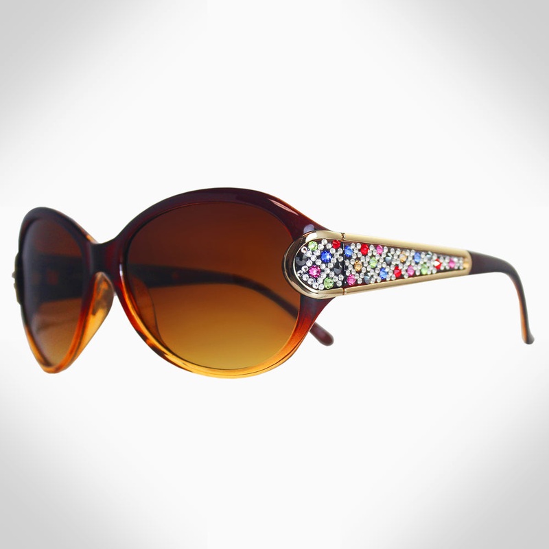 Injection frameTinted lensesFeatures stunning crystals, whichwere set by Jimmy Crystal's expert craftsmanship. This product provides unparalleled aesthetics to transcend elegance.Offers 100% UV/UVB protectionInclude a pouch, clean cloth, and a hard case