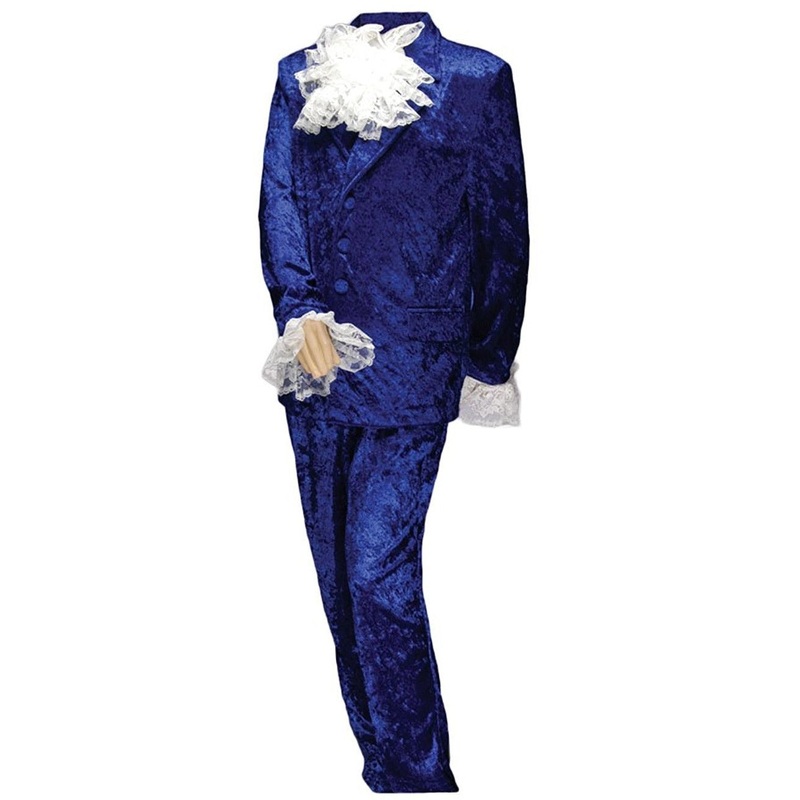 Includes: Velvet Nehru-style jacket with matching velvet pants, lace cuffs and jabot.Ruffled silk shirt available separately.Size: M (44" chest, 36-42" waist ), L (48" chest, 32-40" waist ), XL (50" chest, 38-44" waist), 2XL (54" chest, 40-46" waist)Color: