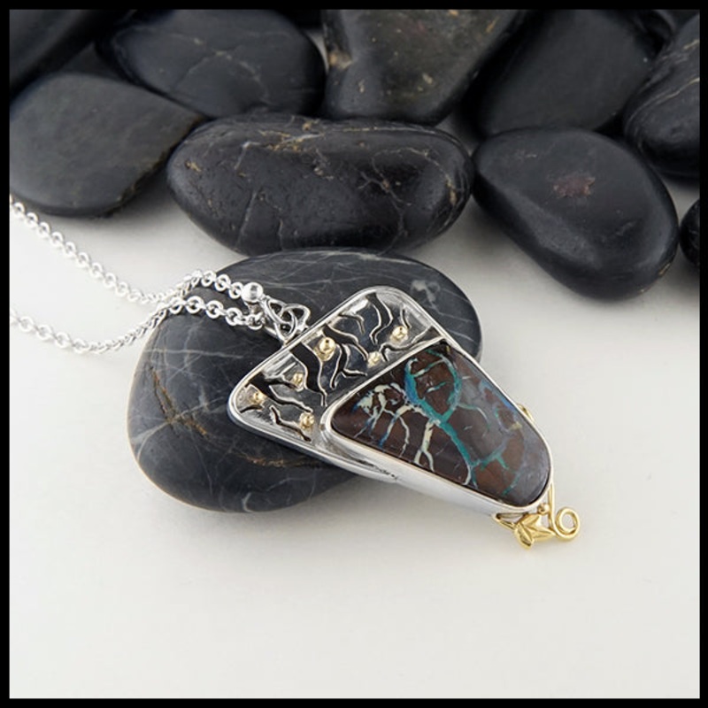 One of a kind custom made Australian Boulder Opal set in sterling silver. This pendant is detailed with Celtic ivy and beads in 14K yellow gold and a trinity knot in sterling silver.Pendant comes with an 18" cable chain.There is only one pendant available.
