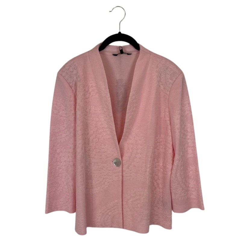 Brand new - donated from the designerMisook baby pink textured cardigan with cropped long sleeves, shoulder pads and a single button closureSize Petite Large (Size 14-16)Size 3X (Size 28W-30W)Estimated Original Retail Price: $40885% Acrylic, 10% Polyester,