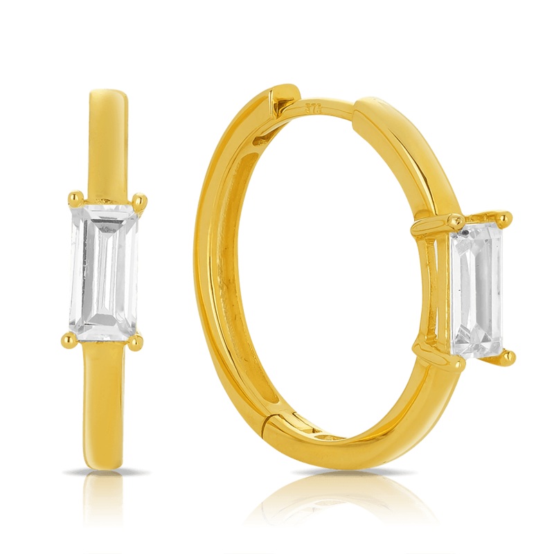 Yellow gold hoops are an every day essential. We love the unique addition of claw set baguette cut cubic zirconias.