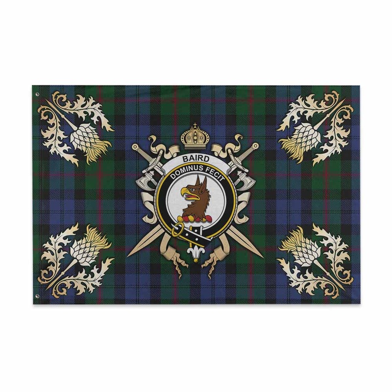 Baird Tartan House Flag with Family Crest and Golden Thistle Crossed Sword DesignEmbrace your Scottish heritage with the House Flag, a vibrant emblem of culture, tradition, and pride. Designed for those who cherish their ancestry, this flag speaks to every