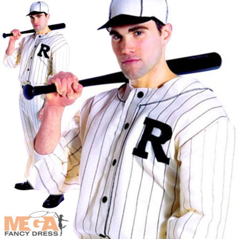 Baseball Player Costume Score a home run with this fantastic Baseball Player Costume which'll have you looking just like legendary Baseball player Babe Ruth with minimal ease. Included is a black and white striped baseball jacket decorated with a printed R