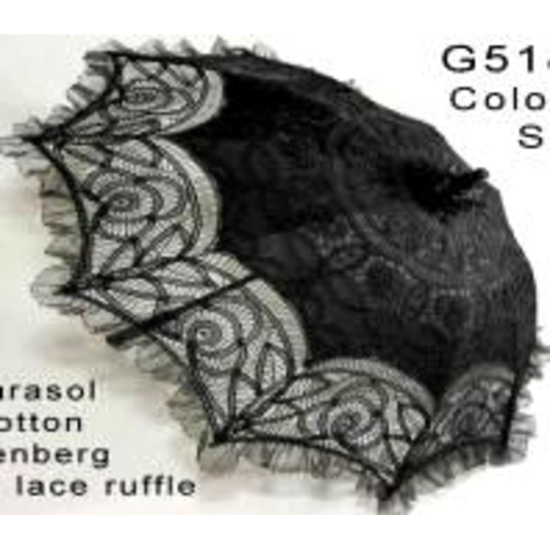 31" wide 26" long beautiful lace parasol w/sheer lace ruffle. Sturdy metal frame w/wood handle& locking closure. 100% CottonColor: Black