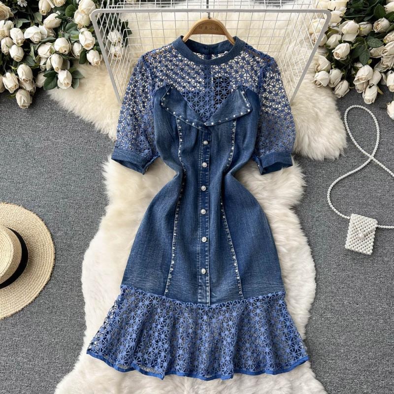 Beaded Round Neck Lace Stitching Denim Mermaid Dress Short Sleeves 370