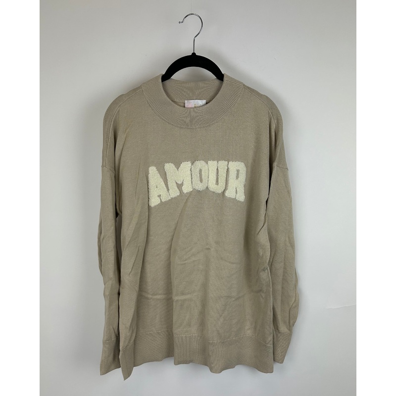 Belle by Kim Gravel beige knit sweater, “amour” cream fleece print, mock neckline, side slits along bottom hemline, soft and stretchy material