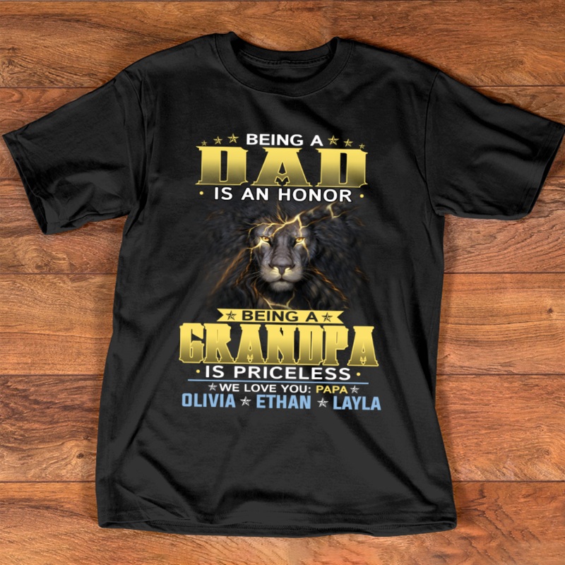 Being a Grandpa lion love grandkidGreat as Birthday gifts or Holiday presents. This adorable item can be designed upon anyone's wish with any title.Please enter:1. Nickname: Papa, Grandpa, Pawpaw, Pop-Pop, Papaw ...etc.2. Kids' Names wanted on the shirt (N