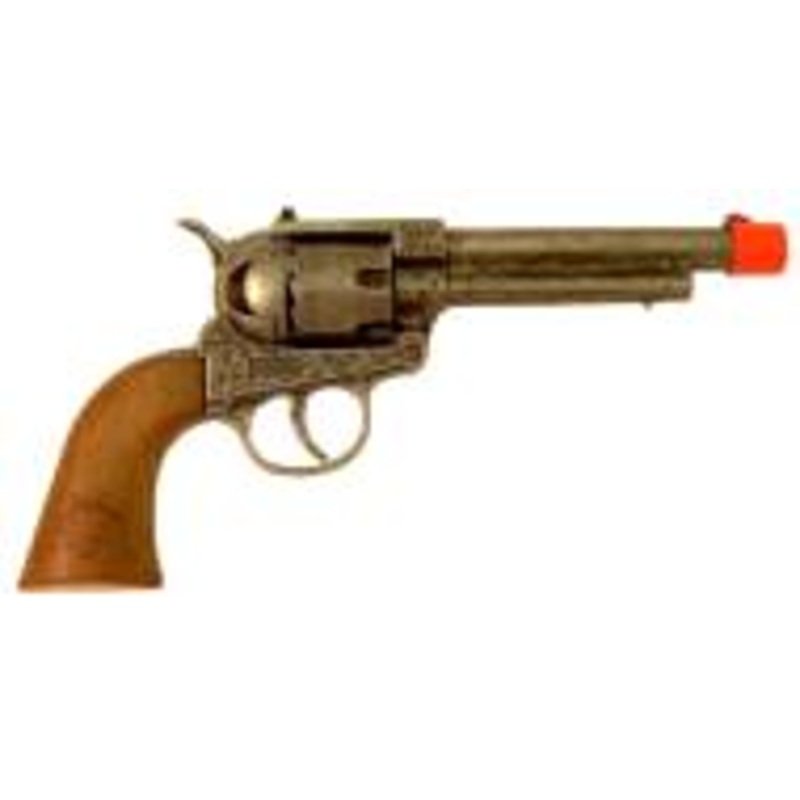Designed after the original Pistolsof the Wild West era. Each gunis constructed with die-cast metal that looks like real antique metal & quality plastic that looks just like real wood. This pistol firesplastic strip caps or ring caps.