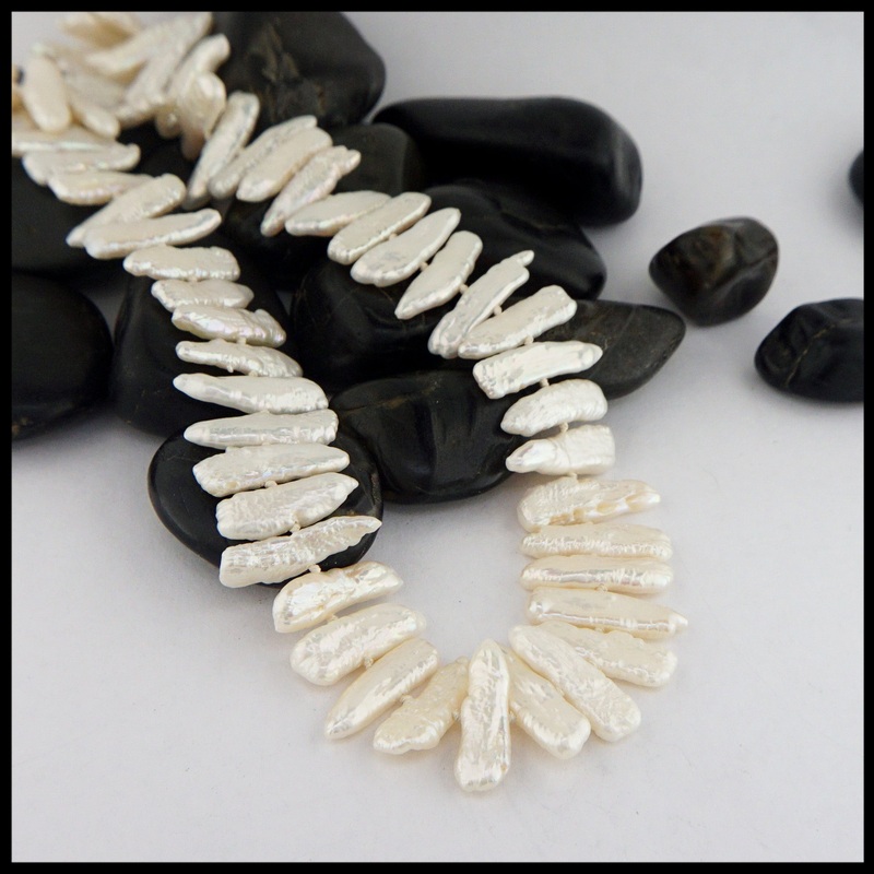 This pearl necklace is made with Freshwater Biwa Pearls and has a14K Yellow Goldclasp.This strand is 18 inches long in total including clasp.