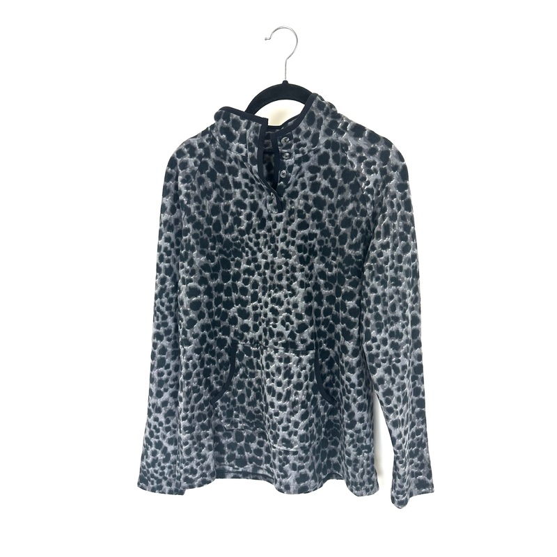 Black and gray fleece long sleeve top with a quarter front button up, high neckline and front pocket