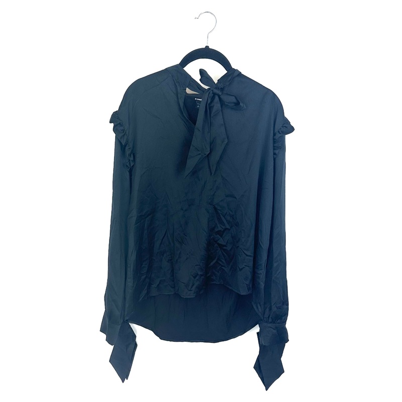 Brand new - donated from the designerExpress black long sleeve blouse with small ruffle trim on shoulder, v-neckline and tie detail on cuffs and neckline in a lightweight fabricSize Small (Size 6-8)Fabric Contents: 100% PolyesterEstimated Original Retail P