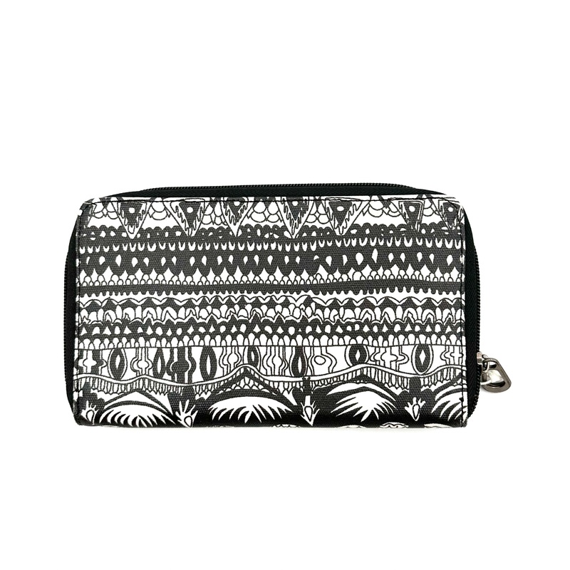 The Sak black card wallet with monochrome abstract pattern print and black trim detailing, silver hardware zipper closure with print lined interior with inner card slot pockets and zipper compartment