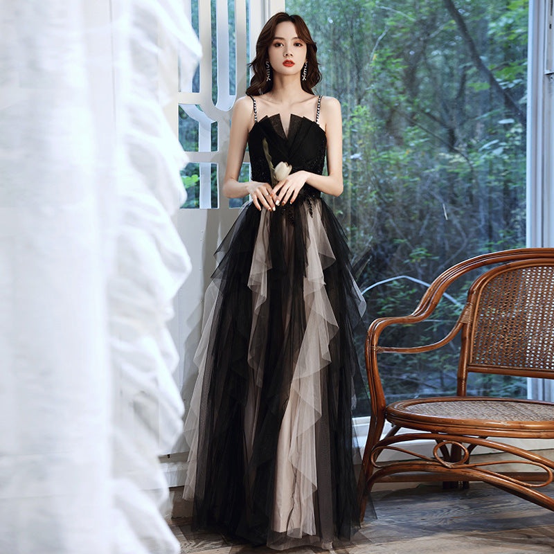 Black Spaghetti Strap Long Prom Dress A Line Evening Party Dress 167