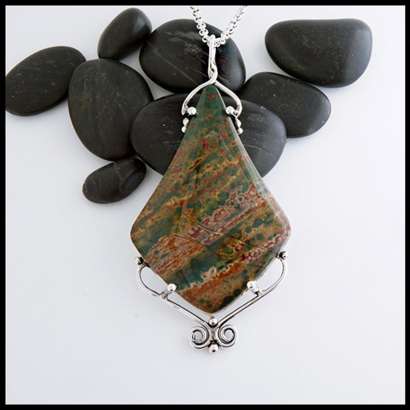 One of a kind statement pendant featuring a large Bloodstone cabochon in a hand fabricated sterling silver setting.This pendant comes on a 18″ Medium Rolo Chain.