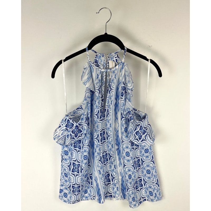 Amanda Uprichard blouse in a blue and white print with ruffle detailingand a front and back keyhole detail.