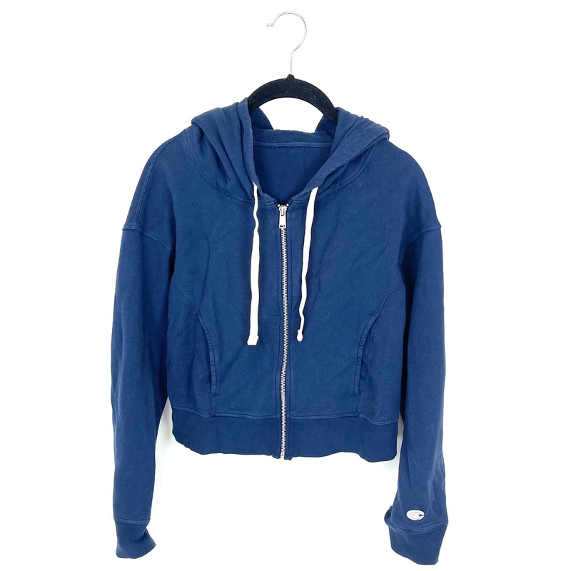 Brand new - donated from designerChampion blue cropped hoodie with a white drawstring through the hood, a silver zipper down the front, two front pockets, and a small white Champion logo on the bottom of the left sleeve.Size Medium (Size 4/6)80% Cotton, 20