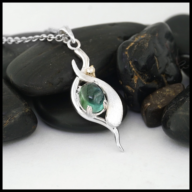 This sterling silver pendant has a custom frame holding a Blue-green tourmaline gemstone as the centerpiece, followed by a diamond prong set in 14K yellow gold. This pendant comes with an 18" cable chain.Original design Tom CarterPlease call or email for m