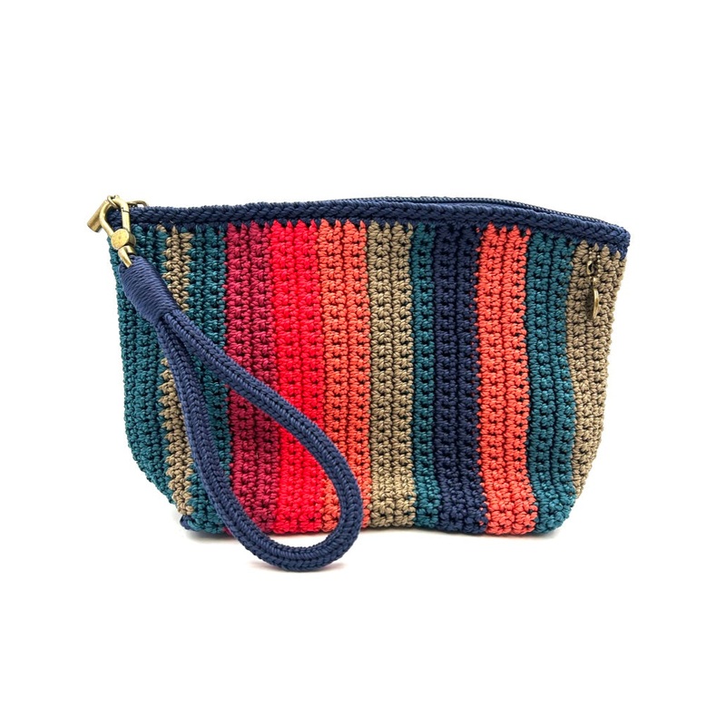The Sak navy blue crochet-style wristlet pouch bag with dark teal, taupe, orange and red multicolor stripe detailing,gold bronze hardware, zipper closure, beige lining with inner pockets and detachable wristlet strap and small keychain