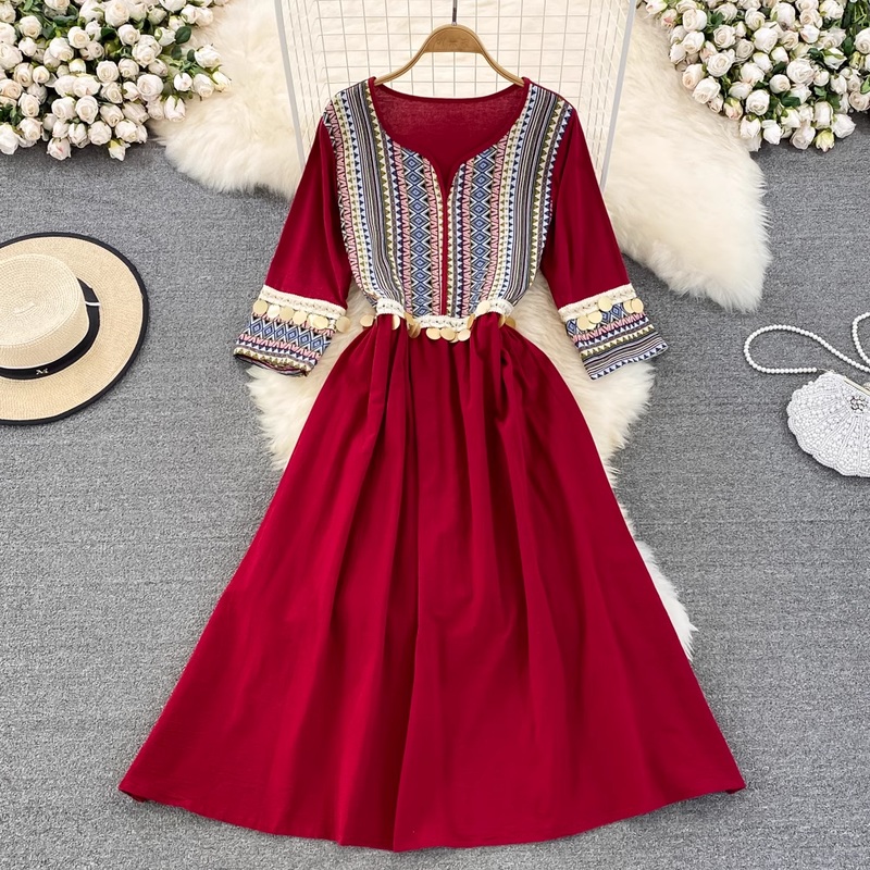 Product NO. :1295Size: one sizeCollar type: V neckWaist type: high waistColor: red ,yellow. blue .whiteSleeve length: medium long sleeveSkirt length: mid-length skirtSize details(cm):Full length 116 Bust 98 Waist 98