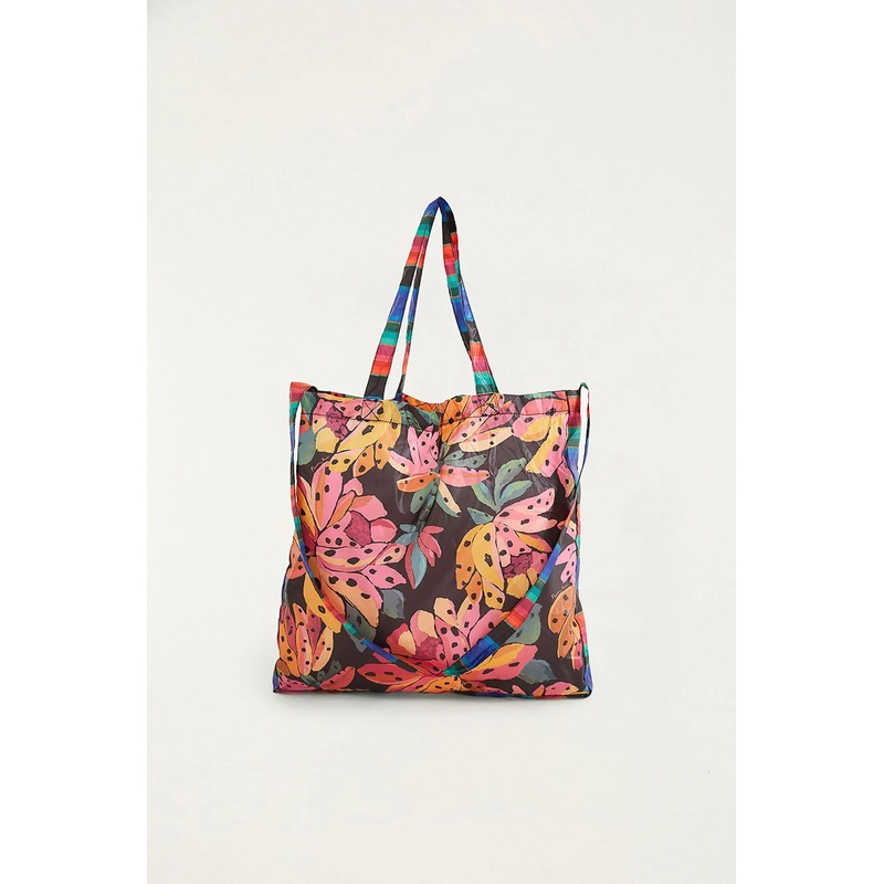 "Take me with you" black banana flower bag. A practical, versatile piece that saves you from the market to the beach. Compact, it's made of printed nylon and comes with a mini bag. A must-have item, as well as a creative and very useful gift. What you don'