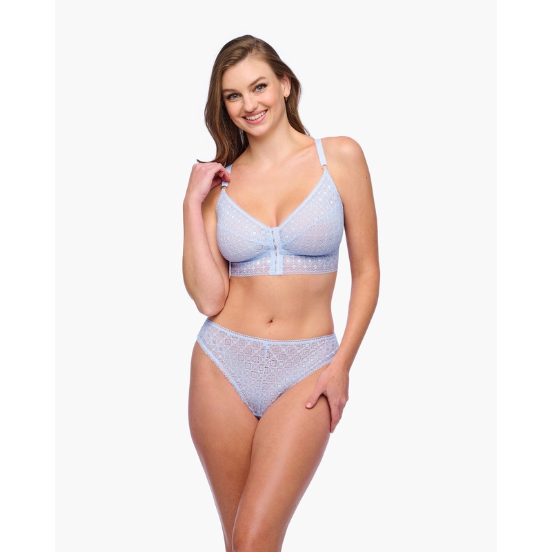 Bralette sans armatures avec fermeture frontaleConu pour les tours de dos plus petits et les bonnets plus grandsDentelle italienne corde avec motif architectural audacieuxStyle dos nageur avec doublure en power meshBretelles larges ajustables et panneaux l
