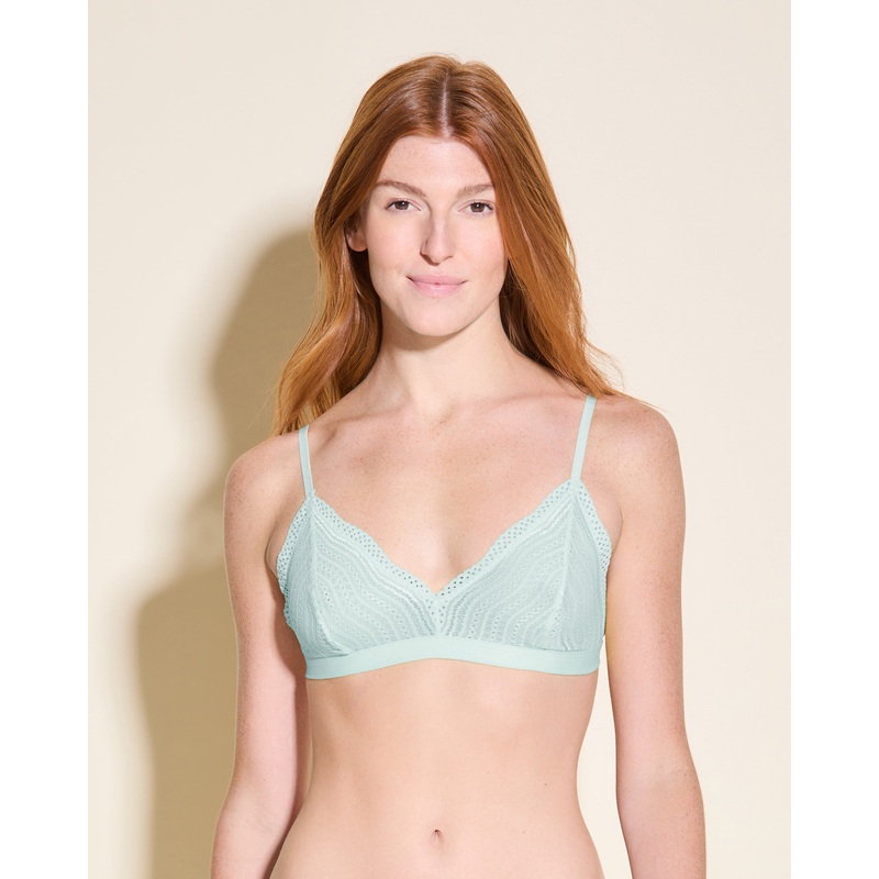 Coppe in bellissimo pizzo a scaglione con rifinitura smerlata lungo i bordi.Spalline regolabili.Coppe senza ferretto, morbide e semi-trasparenti.La banda elastica sotto il seno offre supporto.Chiusura con gancetti 4X1 sulla schiena.Tessuto: 95% poliammide,