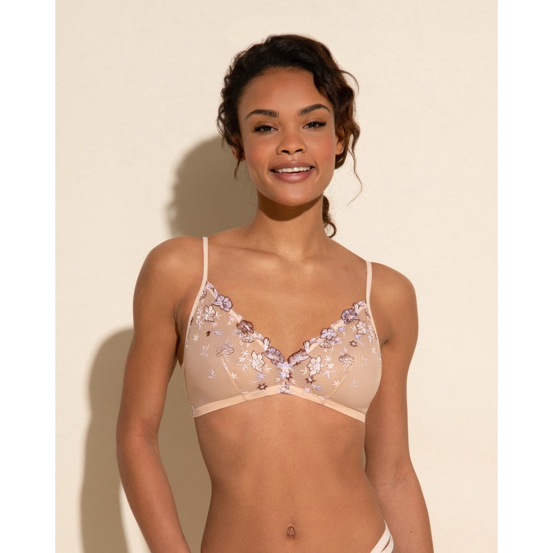 Wireless bralette.Floral embroidery lace with soft sheer mesh gives a tattoo-like effect on the skin.Non-padded, unlined cups.Adjustable, double skinny straps.Hook and eye back closure.Hand wash, do not dry in dryer.Lace: 70% polyamide, 30% polyesterBody: