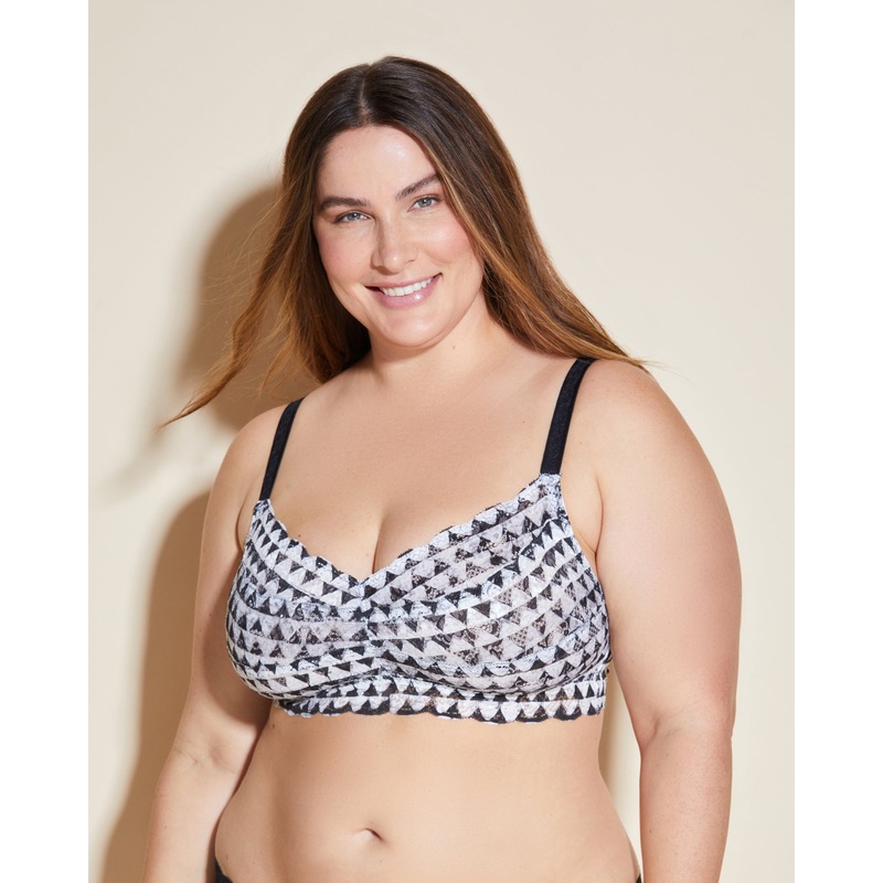 Bralette sin aros diseado con copas grandes y una banda ms extensa.Encaje festoneado semitransparente, elstico, suave y estampado.Copas sin relleno forradas con una malla de refuerzo para aumentar la sujecin.Sin cierres y con una banda de refuerzo bajo el