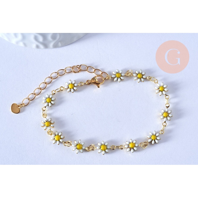 Brass and enameled daisy bracelet, adjustable gold bracelet, gold-plated brass jewelry creation, nickel-free, 18.9cm, unit