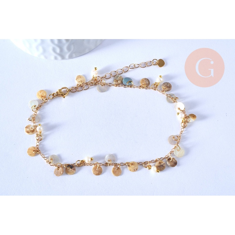 Brass and mother-of-pearl ankle chain bracelet, adjustable gold bracelet, gold-plated brass jewelry creation, nickel-free, summer bracelet, 24.2cm