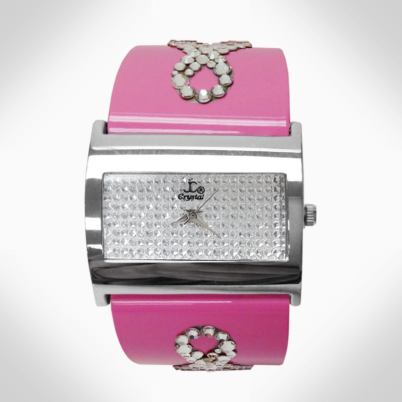 BREAST CANCER AWARENESS - WJ475 Elegant silver-tone watch featuring sparkling crystals accents on the bezel Embellished with crystals, which are set by Jimmy Crystal's expert craftsmanship. This product provides unparalleled aesthetics to transcend eleganc