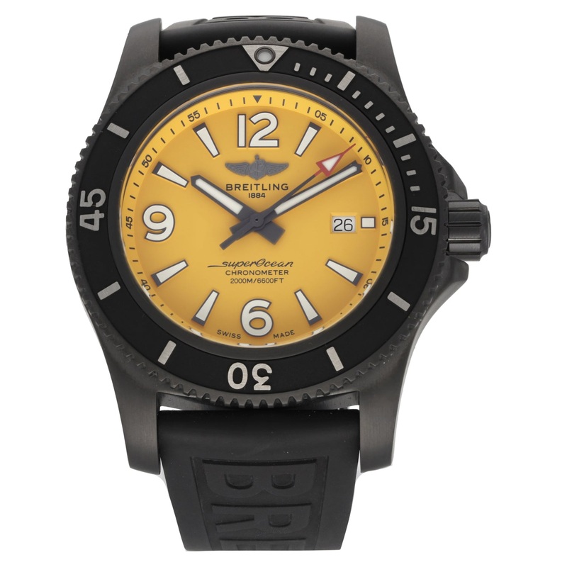 TheBreitling Superoceanis an intricate timepiece which was launched byBreitlingbackin the1957,being a perfect addition to any watch collection. This ex-display example is finished with a yellow dial inside a 46mm DLC stainless steelcase, which is fitted on an adjustable rubberbracelet. The watch is also powered by anAutomaticmovement and is water resistant up to 300metres.
