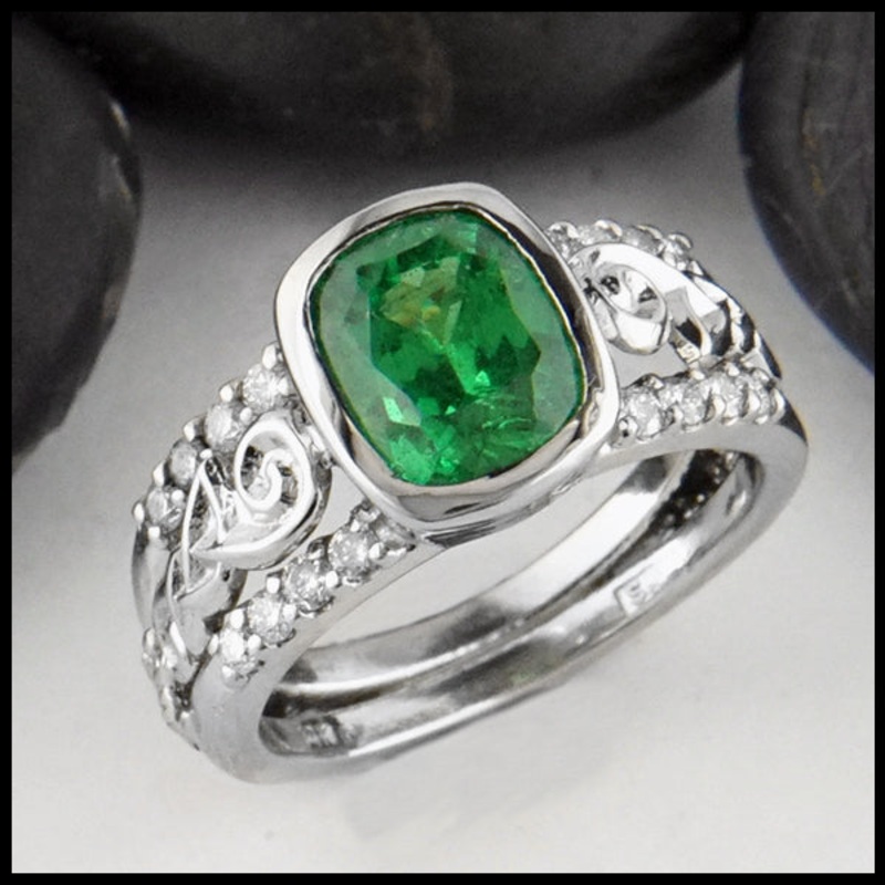 One of a kind custom made 14K White gold ring set with a 2.74ct Bridges Tsavorite stone and .40ct accent diamonds. This ring features modified Celtic knots, a thistle branch, and beads. This ring is currently a size 8 but can be resized upon request.Origin