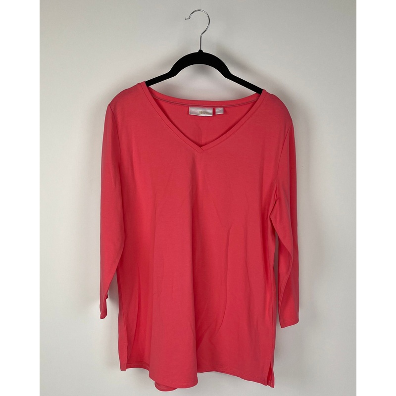 Belle By Kim Gravelbright pink top with v-neckline and long sleeves.