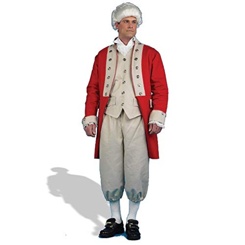 "One if by land" British Redcoat costume features period military style vest, red jacket and knickers.Includes Redcoat with tan accents, silver buttons, vest and pants.Adult Size: M, L, XLWig, shoe buckles, jabot and socks available separately.PA6877 / 100