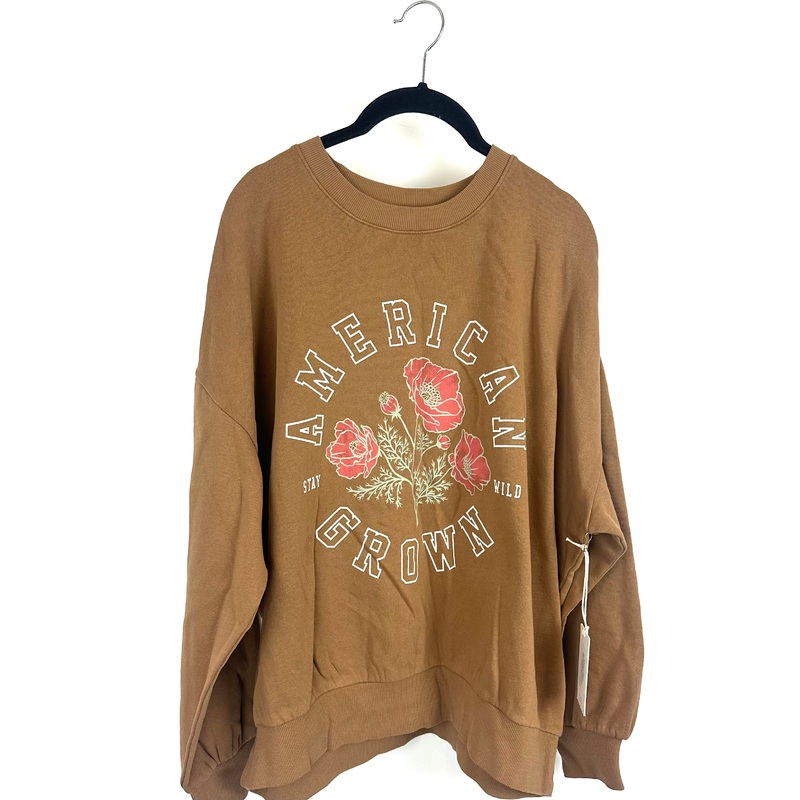 Brand new - donated from the designerZ supply brown oversized crew neck sweatshirt with a red and green floral image and "American Grown Stay Wild" in white text, made with a soft fabricSize 2/4100% CottonEstimated Original Retail Price: $79.00*This is a s