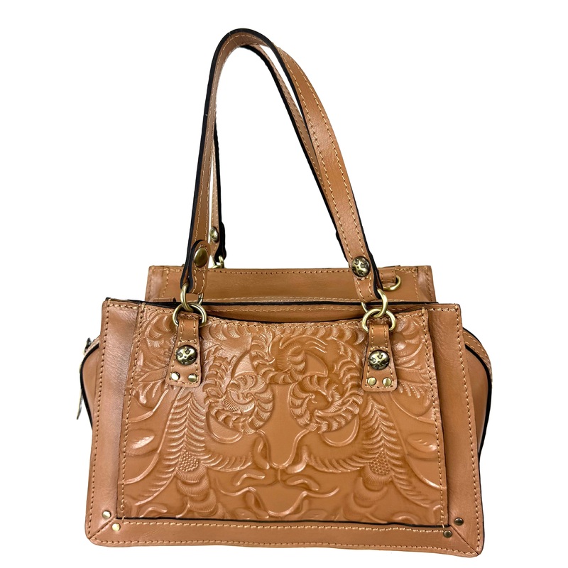 Brand new - Donated by the designerPatricia Nash structured brown leather handbag with a removable and adjustable crossbody strap, floral front embossed leather, front and back exterior snap magnetic button pockets, main compartment zipper closure, double