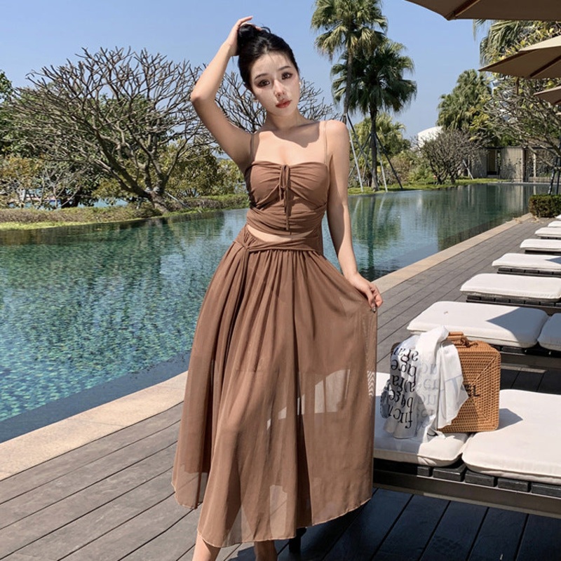 Brown Spaghetti Strap Summer Dress Women Skirt 417