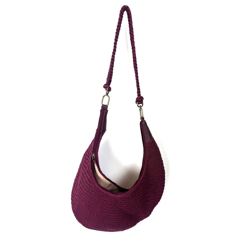 The Sak burgundy shoulder bag with braided rope strap. Main zipper closure with three interior pockets and beige interior.